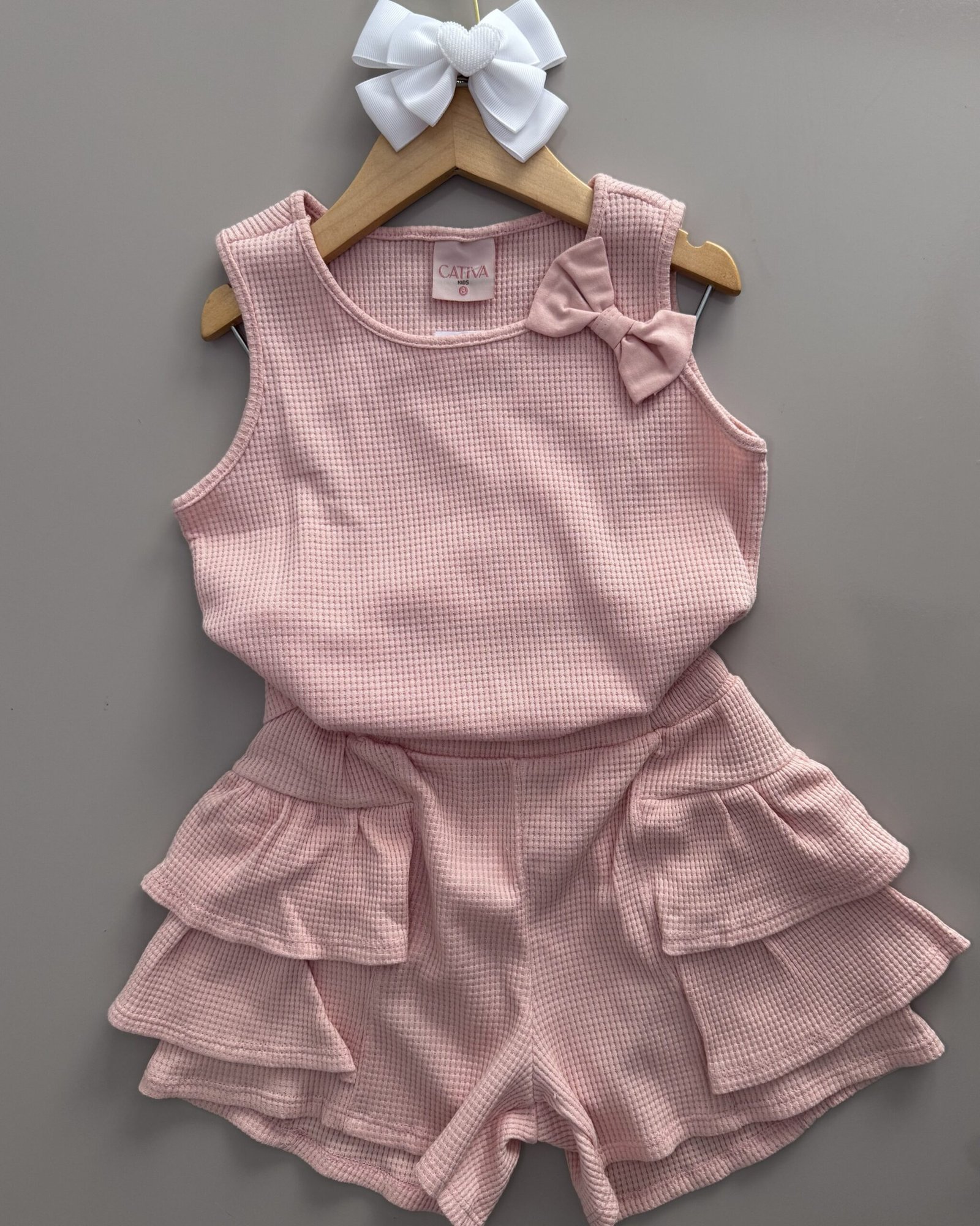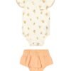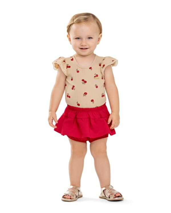 O Conjunto Colorittá é composto por body em malha canelada trabalhada e calcinha em cotton leve. O body possui mangas curtas franzidas com detalhe em renda e estampa de cerejinhas, garantindo charme e delicadeza ao look. Além disso, botões de pressão no entrepernas facilitam o vestir. Já a calcinha conta com elástico no cós e boca das pernas, enquanto o recorte com babado dá um volume especial à peça. Perfeito para deixar os primeiros passeios ainda mais especiais, invista nesse look incrível!