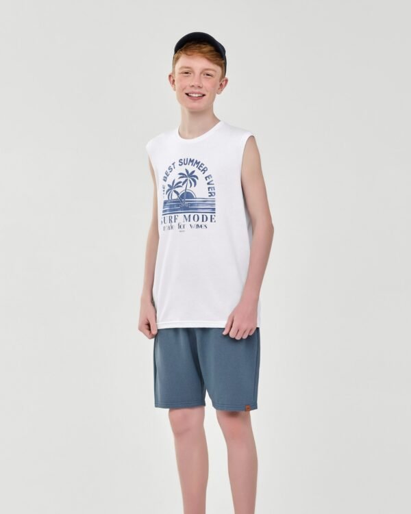 Perfeito para um visual leve e confortável, o Conjunto Elian Beats é composto por regata em meia malha e bermuda em moletom de linho. A regata possui estampa tropical com coqueiros e frases que transmitem o mood de verão. Já a bermuda conta com elástico no cós e bolsos laterais, garantindo praticidade para o dia a dia. Ideal para curtir os dias de sol com estilo e liberdade de movimentos, aposte nesse look completo para compor o guarda-roupa dos meninos!